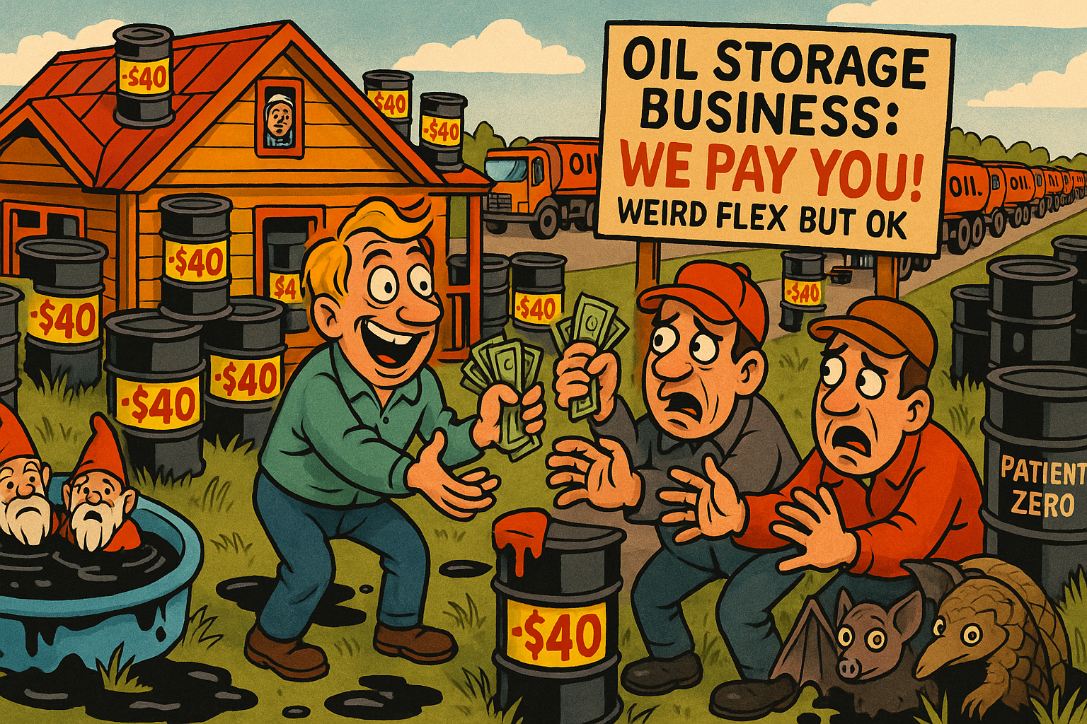 And here comes D-Day. Today’s the last day to execute May oil futures. Today you have to deliver. Oil companies never found buyers. But there’s no space left either. So it’s cheaper to just dump the oil at any price because there’s nowhere to store it. And yes, the oil company is willing to PAY someone to take their oil right now because storage has become too expensive. Insane world.